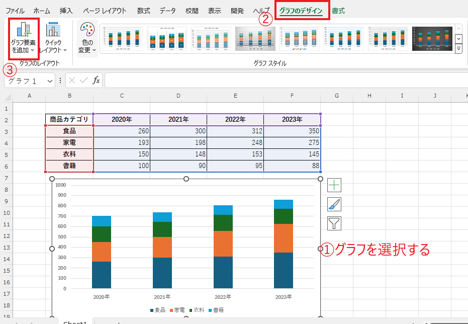 「グラフのレイアウト」グループの「グラフ要素を追加」をクリックします。(③)