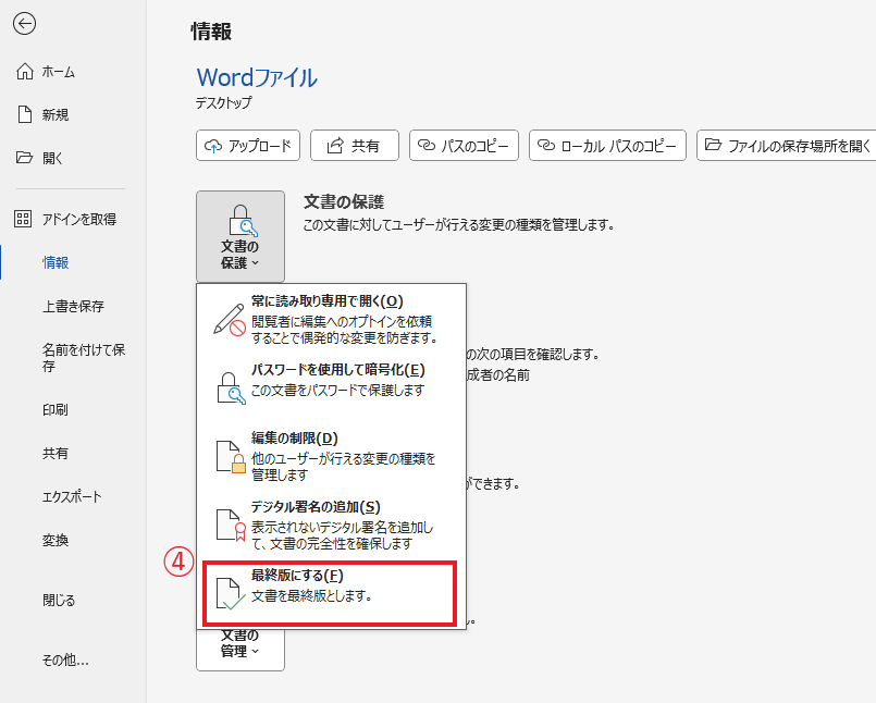 表示されたメニューから「最終版にする」をクリックします。(④)