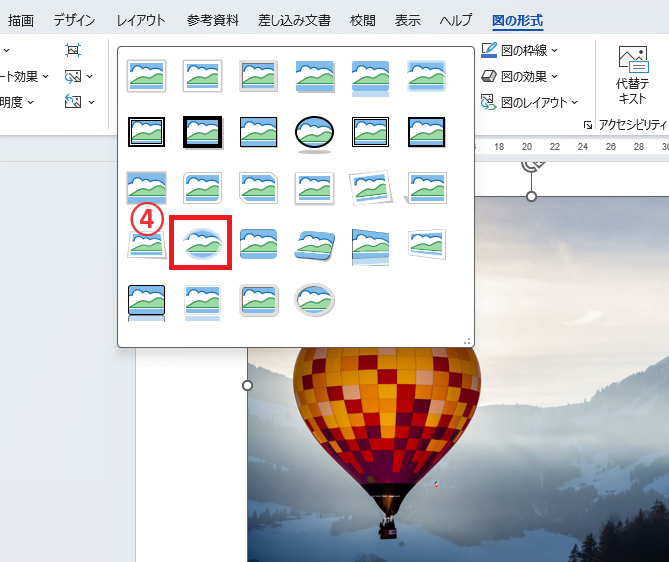- Wordには画像のスタイルが多数用意されており、これを選ぶだけで簡単に画像に枠線や影、ぼかしなどを追加することができる